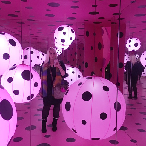 The exhibit opens with artwork from the artist- some of which has never before been on display (above images). The first installation is Infinity Mirror Room- Phalli’s Field (1965/2016). This installation is considered to be Kusama’s most important breakthrough as an artist and casts the visitor as the subject of the work- in a field of phallic symbols (yep) seen over and over again in the mirrored reflection. This is also the most brightly lit room, so if you’re looking for really good pictures- this is the room to do so…...in a sea of red polka dotted phallic symbols. (I’m sorry, but the humor here gets to me, lol).