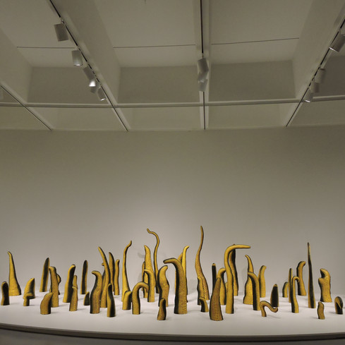 Kusama's Infinity Mirrors are symbolic of infinity- they offer the illusion of infinite space in a visually stunning environment. The rooms are small, but make your emotions high. You’ll see yourself hundreds of times in the reflection of the mirrored box and the lights and visual installations will make your perceptions roar. On display are 6 of the Infinity Mirror Rooms- the most that have ever been shown together. The rooms all represent something from Kusama’s life or represent the meaning of life and its aftermath. For example, the Infinity Mirror Room- Aftermath of Obliteration of Eternity (2009), represents death and the afterlife, with lanterns hung throughout the room that dim and glow, representative of the Japanese Tradition of toro nagashi, lighted lanterns that are placed in the river to guide spirits back to their place of peace and rest during the summer obon festival. This was my favorite room, as it made me feel peaceful- and also made me think of my mom.